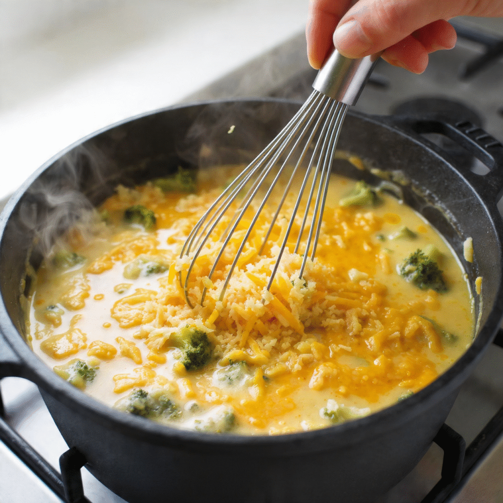 Once cheese is fully melted and soup is silky, stir in the blanched broccoli florets. Let them warm through for 2 minutes. Taste and adjust seasoning—add more salt, pepper, or a dash of hot sauce if desired. The soup should be thick enough to coat a spoon but still spoonable.