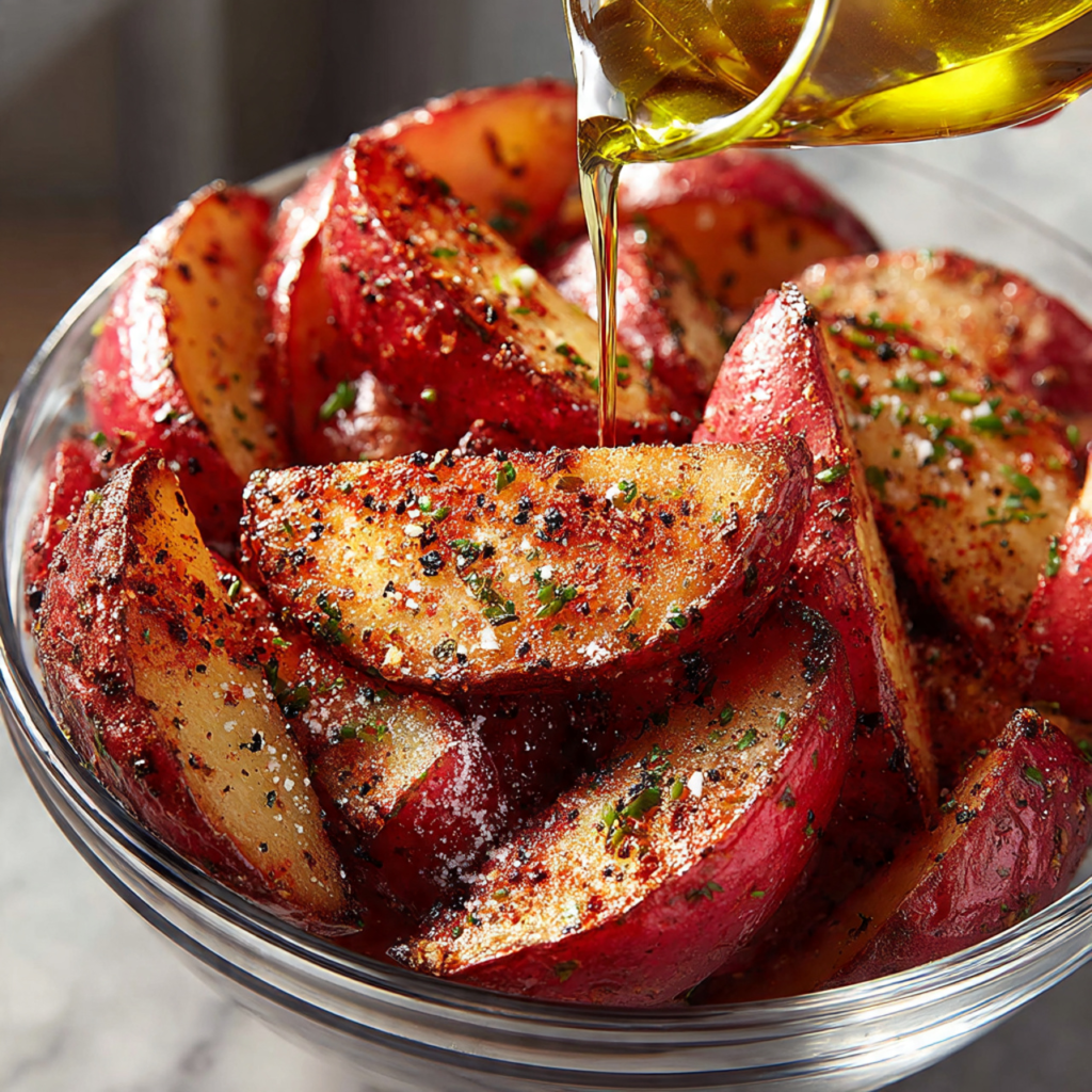 Drizzle the olive oil over the dry potatoes in the large bowl. Sprinkle the dry seasoning mixture over the top.
