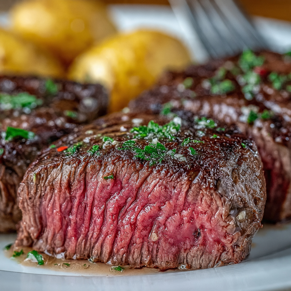 Close-up of juicy garlic butter steak bites with golden potatoes