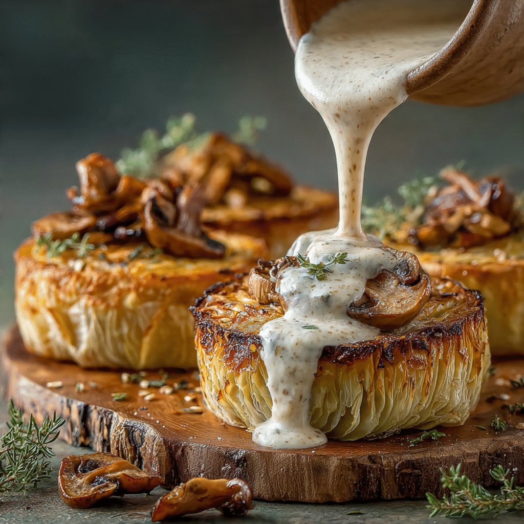 Place each cabbage steak on a warm plate. Spoon ¼ cup of mushroom salus sauce over the center, allowing it to cascade down the sides. Garnish with fresh parsley and a final drizzle of olive oil. Serve immediately while the cabbage is hot and the edges maintain their crispness.
